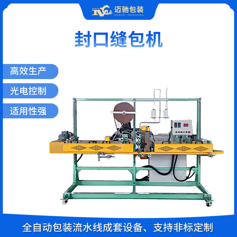 該設備適用于包裝重量5-50kg的重型大袋的自動封口縫包,適用于單層或多層牛皮紙袋,紙塑(PE)復合袋,紙塑編織復合袋、彩膜復合袋。工作流程:該機型可按程序自動完成包裝袋口的內袋熱合,縫合,剪線辮,袋口修剪,包紙帶、剪紙袋、熱封、壓合工序。