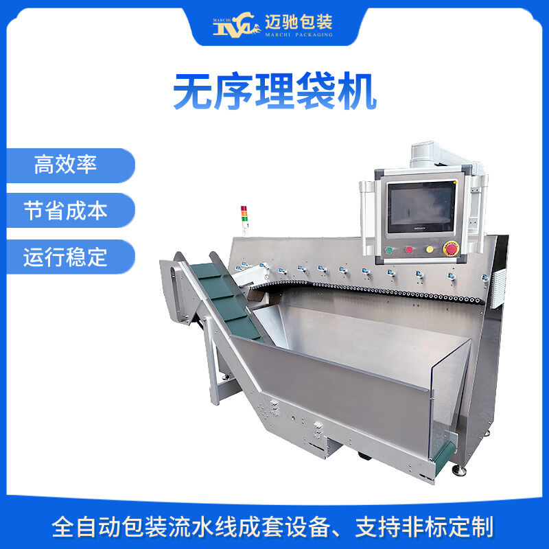 自動理袋機可在生產中單獨使用,也可以與裝盒機對接,完成無規則的堆積物料從集中到分散再到順序擺放的整個整理過程。無規則堆積物料倒入儲料倉后,料倉輸送帶動作,將物料輸送至低速滾輪上。設備通過低、中、高速滾輪的運轉,將物料逐一順序送出理袋機。送出的物料根據包裝需要的形式或順序或堆疊進入裝盒機輸送當中完成下一工序的裝盒過程。